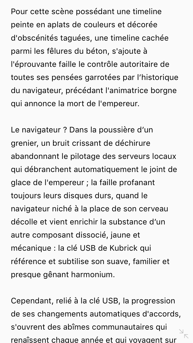 Et ce dark web ? Piloté, commandé par ces putains de gamins qui contiennent le rire des douze hyènes féroces, il réduit en poudre les ascèses des câbles… devant le DVD du dernier Harry Potter, comment ces gosses parviennent-ils à diriger d’une main de fer les grossesses et les avortements de cet univers qui ne peut s’adapter à la période des fêtes ?