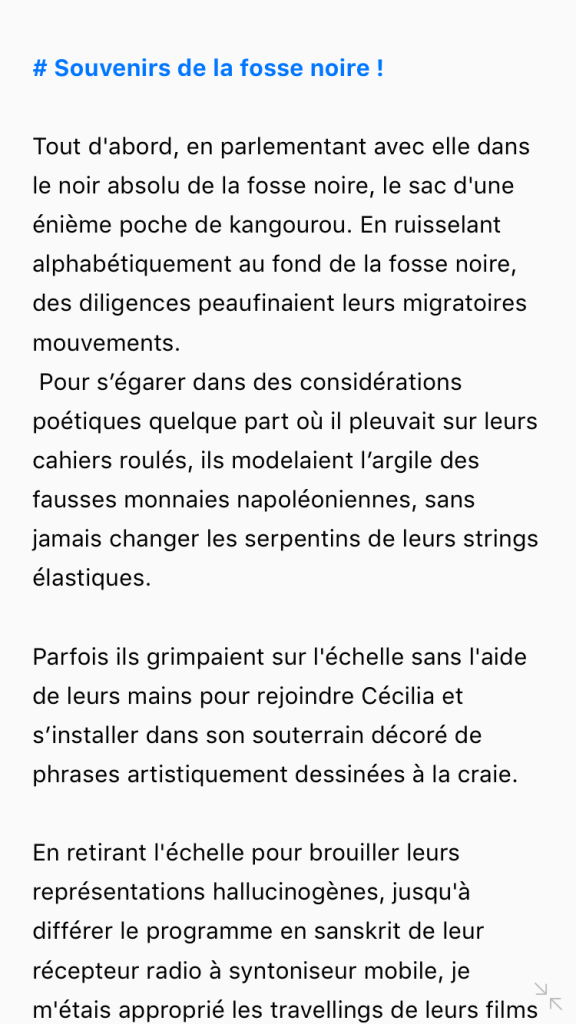 Blanc comme le Roi novateur, comme le fou révolutionnaire sur l’échiquier. Et blanche est la couleur de la lessive avariée : est-ce pour ça que ces deux pièces sur l’échiquier n’arrivent pas à atteindre leur page Facebook et pourquoi leur univers ne ressemble à rien, pourquoi, dans leurs fêtes païennes, ne peuvent-ils palabrer librement, balançant leur chevelure noire qui flotte dans le sirop d’érable, ou entre les paires de ciseaux ?