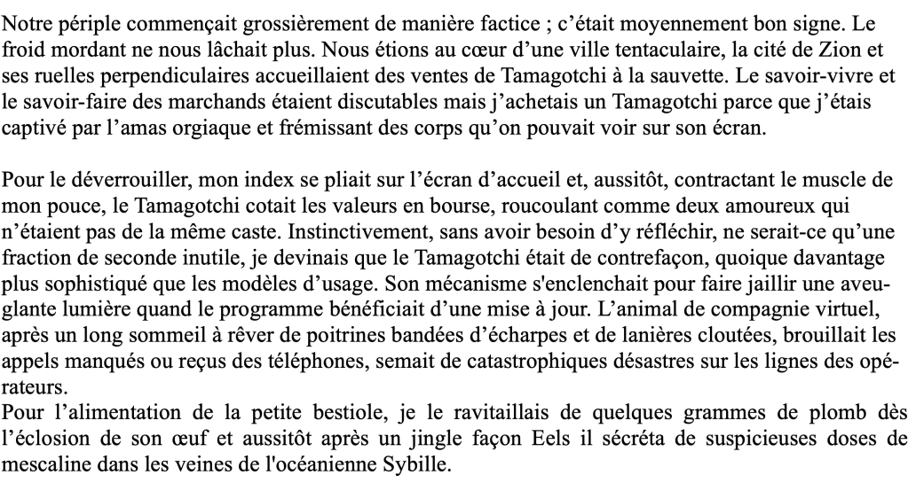 Notre périple commençait en somme de manière tout à fait factice ; c’était moyennement bon signe. Le froid mordant ne nous lâchait plus. Nous étions au cœur d’une ville tentaculaire, la cité de Zion et ses ruelles perpendiculaires accueillaient des ventes de Tamagotchi à la sauvette. Le savoir-vivre et le savoir-faire des marchands étaient discutables mais j’achetais un Tamagotchi parce que j’étais captivé par l’amas orgiaque et frémissant des corps qu’on pouvait voir sur son écran.
