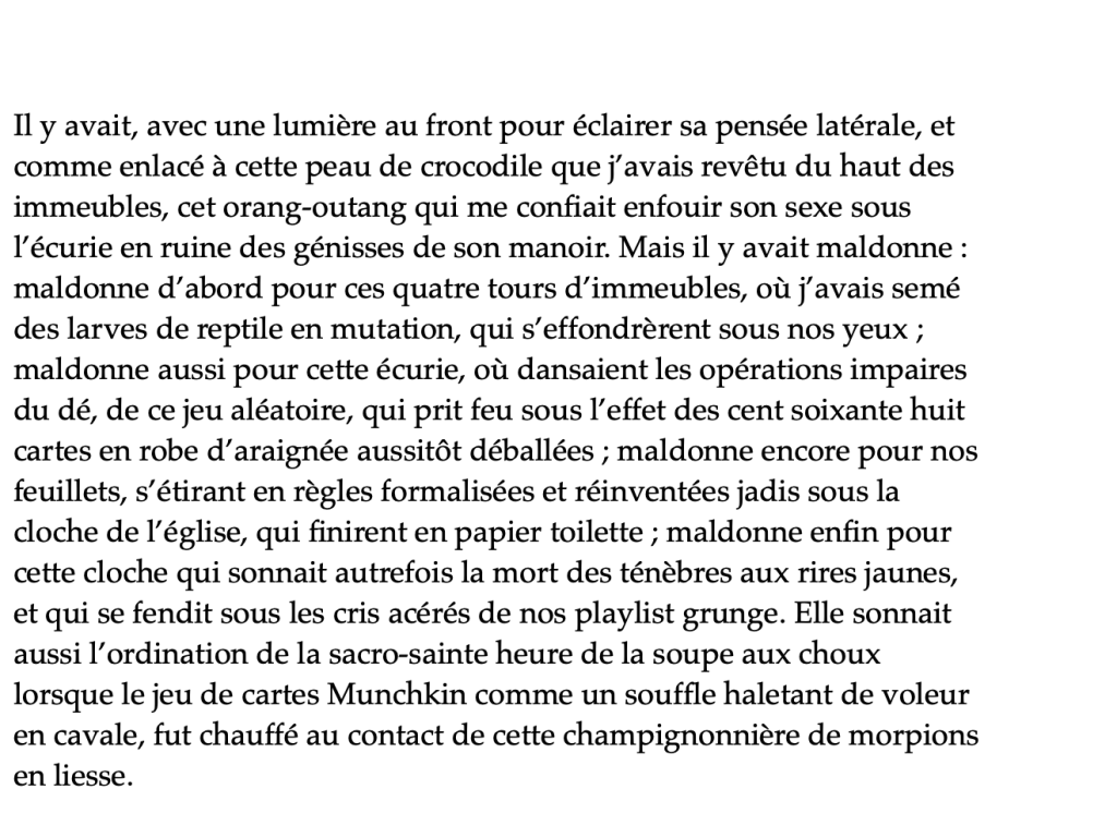 Il y avait, avec une lumière au front pour éclairer sa pensée latérale, et comme enlacé à cette peau de crocodile que j’avais revêtu du haut des immeubles, cet orang-outang qui…