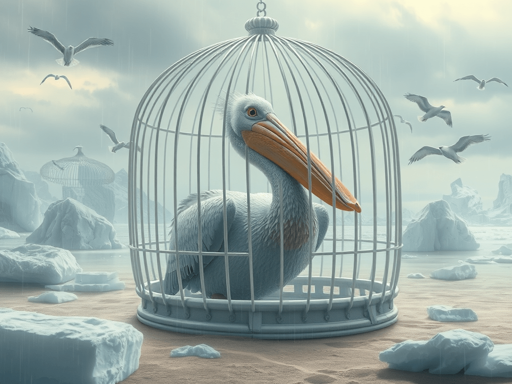 Ensablées et paradisiaques banquises où sans fin un pélican fuit… On ne discerne — en le ramenant chez moi et en l’enfermant dans une cage d’ivoire — que son jabot énorme dans cet épisode onirique, fermement résigné à avaler tout ce qu’il lui passe dans le gosier ; ensablées et paradisiaques banquise que des rats d’égout ont entrepris de grimper et de profiter de la vue sur une hauteur de cinquante lieues au-dessus de ces mers polaires…