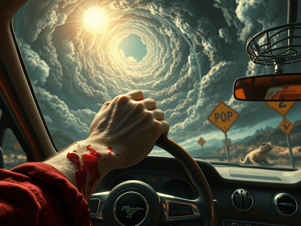 Le système s’était enrayé, devenant de moins en moins gérable. Leurs balivernes à tous ces politiciens gangrénaient tout jusqu’à l’Audimat. Mais actuellement Thompson étant dans un état proche de l’hypnose il s’en foutait et regardait l’une de ses mains qui était ensanglanté tandis que l’autre tentait de réajuster la trajectoire de sa vieille Mustang tout en matant un vortex qui voilait à présent le ciel et une pancarte sur lequel on pouvait lire que les fanatiques des films en super-huit s’entretueraient avant qu’il puisse enquêter de son côté. Et il lui semblait que ces reptiles irascibles le long du bas-côté de la route l’observaient, calanchant ensuite sous les effets des rayons d’un soleil malgré tout affligeant…